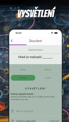 Lietotnes galvenā priekšrocība ir tās inteliģentā vingrinājumu sistēma. Čeština spēj gudri atlasīt jautājumus, koncentrējoties uz tām tēmām, kurās lietotājam ir grūtības, un atkārtojot kļūdaini atbildētus jautājumus, lai nodrošinātu dziļāku izpratni. Katram jautājumam ir pieejami rūpīgi sagatavoti paskaidrojumi, kas detalizēti izskaidro konkrēto valodas parādību, papildinot tos ar retāk sastopamu vārdu vai frāžu nozīmi. Speciāli izstrādātā sadaļa iestājeksāmeniem piedāvā uzdevumus, kas pēc satura un formāta ir identiski oficiālajiem testiem, aptverot visu nepieciešamo gramatiku, pareizrakstību, vārdu krājumu un sintaksi. Tā precīzi identificē vājās vietas, iesakot mērķtiecīgu atkārtošanu, īpaši noderīgi tiem, kas virzās uz astoņgadīgajām ģimnāzijām.