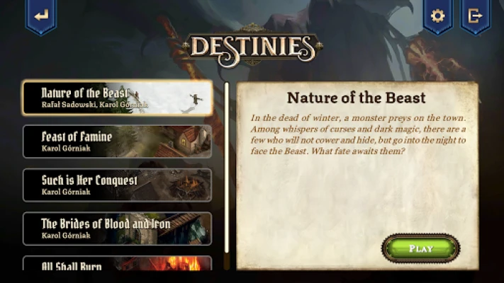 Sagatavojieties aizraujošām spēles sesijām, kas ilgst 120-150 minūtes. Jums būs iespēja izvēlēties starp atsevišķiem, autonomiem scenārijiem vai iesaistīties sarežģītā kampaņā, kur katrs posms veido vienotu stāstu. Pēc izvēlētā scenārija satura ielādes lietotne darbojas pilnīgi bez interneta savienojuma, garantējot nepārtrauktu spēles pieredzi jebkurā laikā un vietā. Turklāt, "Destinies" piedāvā valodas izvēles iespējas lietotnes iestatījumos un automātiski saglabā jūsu progresu, ļaujot jums viegli atsākt spēli vēlāk.